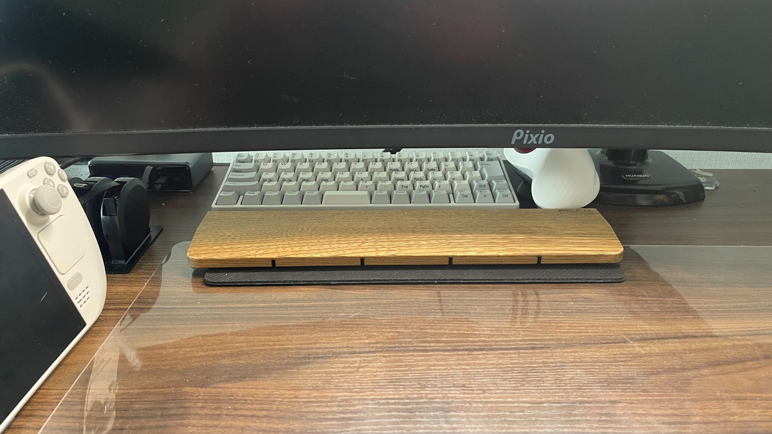 FILCOのLサイズ(幅440mm)は、HHKBとトラックボールM575SPdを横に並べた状態で、2台がほぼすっぽり収まるサイズ感だ。リストレストの上に手を置いたとき、キーボード側もトラックボール側も手首が自然な角度でサポートされる。木の硬さはあるものの、オスモカラー仕上げのさらっとした手触りが長時間の作業でも不快感を与えない。天然木ならではの質感が、デスクに道具としての存在感を加えてくれる。